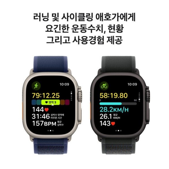 Apple Watch Ultra 2를 선택하는 이유—궁극의 스포츠 및 모험용 시계를 소개합니다. Ultra 2에는 러닝, 사이클, 수영, 하이킹, 다이빙 등 다양한 활동을 즐기는 이들을 위한 각종 첨단 기능이 탑재되었습니다. 극강의 내구성을 자랑하는 티타늄 케이스에 새틴 질감의 블랙 마감이 새롭게 추가되고, 놀랍도록 밝은 상시표시형 Retina 디스플레이와 매우 정확한 정밀 이중 주파수 GPS까지 지원되죠.1 여기에 강력한 건강, 안전 및 연결성 관련 기능2과 더불어 일반 사용 시 최대 36시간, ‘저전력 모드’에서 최대 72시간의 배터리 사용 시간까지 누릴 수 있답니다.3 극강의 내구성, 놀라운 기능성—49mm 내부식성 티타늄 케이스. 사파이어 전면 크리스털. 다양한 기능을 즉시 제어할 수 있게 해주는 커다란 Digital Crown 및 맞춤 설정이 가능한 ‘동작 버튼’. MIL-STD 810H 테스트 진행.4 여기에 100m 방수 등급까지.5 셀룰러가 선사하는 자유—셀룰러 요금제에 가입하면 iPhone을 두고 나와도 전화 통화와 문자를 할 수 있죠.6 좋아하는 음악과 팟캐스트를 스트리밍하고, ‘지도’ 앱에서 길 안내를 받을 수도 있습니다. 운동 효과 극대화—‘운동’ 앱에서 ‘심박수 영역’, ‘사용자 설정 운동’과 같은 각종 첨단 수치, 현황 등을 살펴볼 수 있습니다. 시간이 지남에 따라 운동이 당신의 신체에 어떤 영향을 미치는지 한눈에 볼 수 있게 해주는 ‘훈련량’도 확인할 수 있죠. 달리기 마니아를 위한 기능—놀랍도록 정확한 정밀 이중 주파수 GPS를 갖춘 것은 물론,1 달리기 자세에 관한 첨단 수치들을 통해 얼마나 효율적으로 달리고 있는지 보여줍니다. ‘사용자 설정 운동’ 기능을 활용해 준비 운동, 회복 인터벌, 마무리 운동 시간까지 직접 짤 수 있죠. 사이클 마니아를 위한 기능—유용한 수치들이 사이클 경험을 새로운 차원으로 끌어올려 줍니다. ‘운동 현황’에서는 속도, 심박수, 고도 등을 한눈에 파악할 수도 있죠. 당신이 차고 있는 Apple Watch에서 사이클링 운동을 시작하면, 갖고 있는 iPhone의 ‘실시간 현황’에도 수치가 나타나기 때문에 더 편하게 확인할 수 있습니다. 파워 미터 같은 Bluetooth 액세서리와 직접 연결해 FTP(Functional Threshold Power)와 케이던스 같은 데이터를 보는 것도 가능하죠. 하이킹 마니아를 위한 기능—‘나침반’ 앱에는 현재 방향, 고도, 경위도 등 하이킹을 안전하게 즐기는 데 꼭 필요한 방향 탐색 도구들로 가득 차 있습니다. 셀룰러 신호를 마지막으로 수신한 위치를 확인하고, ‘나침반 경유지’ 기능으로 현재 위치를 표시할 수도 있죠. ‘경로 되짚기’ 기능은 당신이 거쳐온 곳을 기록해 주기 때문에, 지나온 경로를 되짚을 수도 있답니다. 수영 마니아를 위한 기능—‘스트로크 자동 감지’, ‘랩 수’, ‘스플릿’, ‘세트’, ‘수영(수영장)’ 종목을 위한 ‘사용자 설정 운동’ 등 다양한 수영 관련 기능이 마련되어 있습니다. 야외 수영을 즐길 때에는 운동 요약 화면에서 수영 경로 지도를 확인할 수도 있죠. ‘조수’ 앱에서 115,000개가 넘는 전 세계 해변의 조수 상태를 볼 수도 있답니다. 다이빙 마니아를 위한 기능—Oceanic+ 앱이 Apple Watch Ultra 2를 온전한 다이빙용 컴퓨터로 변신시켜 줍니다.7 수온을 측정하고 최대 수심 40m까지 감지할 수도 있죠. 여기에 EN13319 인증까지 획득했답니다. 첨단 건강 및 안전 기능—심전도 검사.8 심장 박동이 불규칙할 때 알림을 받을 수 있습니다.9 야간 건강 수치, 혈중 산소 포화도를 확인할 수도 있습니다. 게다가 ‘REM 수면’, ‘코어 수면’, ‘깊은 수면’ 등 여러 수면 단계에서 어느 정도의 시간을 보냈는지 알 수 있고, 당신이 심하게 넘어지거나 심각한 자동차 충돌이 발생하면 이를 감지하고 자동으로 응급 서비스에 연결해 줄 수도 있죠. 버튼을 눌러 긴급 구조 요청을 하거나 사이렌을 울릴 수도 있답니다.10