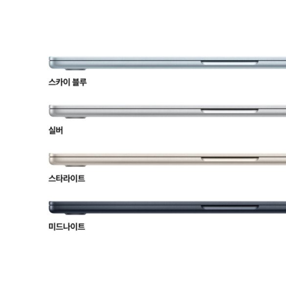 막강한 성능의 M4 칩 탑재—여러 앱을 넘나들며 작업할 때도, 동영상을 편집할 때도, 고사양 그래픽 게임을 플레이할 때도, Apple M4 칩이 무슨 일이든 더 빠르게, 더 매끄럽게 처리해 냅니다. Apple Intelligence를 위한 탄생—Apple Intelligence는 당신이 글을 쓰고, 개성을 표출하고, 이것저것 척척 처리하는 것을 도와주는 개인용 지능 시스템입니다. 혁신적인 개인정보 보호 기능도 갖추고 있어 Apple은 물론 그 누구도 당신의 개인정보에 접근할 수 없으니 안심하고 쓸 수 있죠. 최대 18시간의 배터리 사용 시간2—MacBook Air는 배터리만으로 작동 중일 때도, 전원에 연결했을 때도 똑같이 놀라운 성능을 선사합니다. 가뿐한 휴대성—엄청나게 가벼운 무게와 1cm 남짓한 두께로 가방에 쏙 들어가는 MacBook Air는 이동이 잦은 당신의 일상에도 자연스레 스며듭니다. 찬란한 디스플레이—38.9cm Liquid Retina 디스플레이가 10억 개의 색상을 지원합니다.3 풍부한 대비와 또렷한 디테일로 사진 및 동영상은 더욱 생생하게, 텍스트는 짱짱한 선명함으로 보여주죠. 당신의 모습과 목소리를 최고의 상태로—12MP Center Stage 카메라가 또렷한 화질을 선사하고, 3개의 마이크, 공간 음향을 지원하는 6개의 스피커가 뛰어난 음질을 선사합니다. 뛰어난 연결성—MacBook Air는 Thunderbolt 4 포트 2개, MagSafe 충전 포트, 헤드폰 잭, Wi-Fi 6E, Bluetooth 5.3을 갖추고 있습니다.4 게다가 외장 디스플레이를 최대 2대까지 지원하죠. 앱을 쏜살같이 빠르게 구동하는 macOS5—Microsoft 365, Adobe Creative Cloud, Google Workspace 등 당신이 즐겨 쓰는 모든 앱이 macOS에서는 전광석화처럼 빠르게 실행됩니다. iPhone을 사랑한다면 Mac도 사랑하기 마련—Mac을 당신의 다른 Apple 기기와 함께 사용하면 마법 같은 경험을 할 수 있습니다. ‘iPhone 미러링’ 기능으로 Mac에서 iPhone 화면을 확인 및 조작할 수 있습니다.6 iPhone에서 복사한 내용을 Mac에 붙여넣을 수도 있죠. Mac에서 ‘메시지’ 앱을 사용해 문자를 보내고, FaceTime 통화를 걸거나 받을 수도 있답니다.7